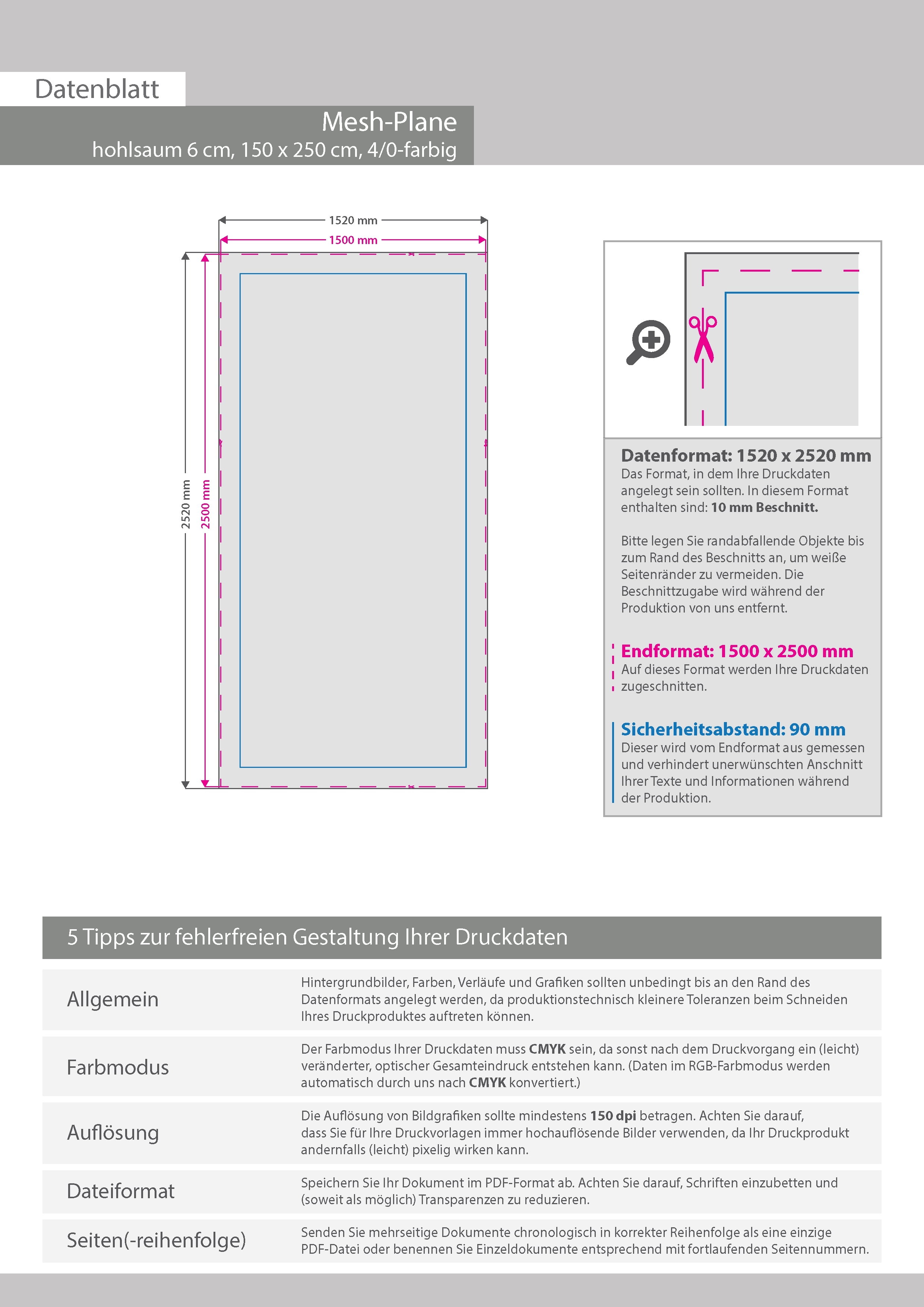 Hochwertige Mesh-Plane 150 x 250 cm, 4/0-farbig bedruckt, Hohlsaum oben und unten (Durchmesser Hohlsaum 6,0 cm)