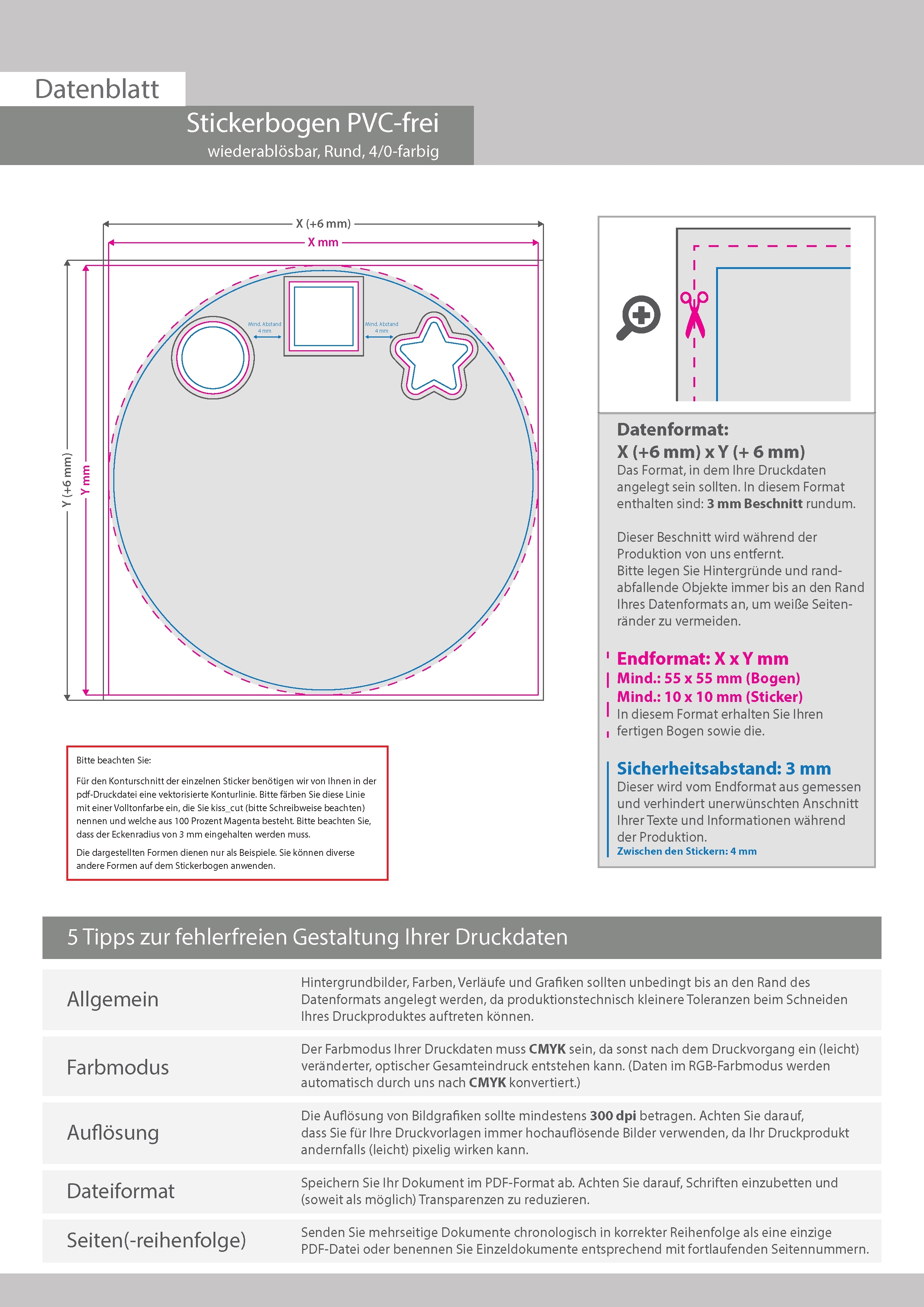 Stickerbogen wiederablösbar PVC-frei, 4/0 farbig bedruckt rund (kreisrund konturgeschnitten)